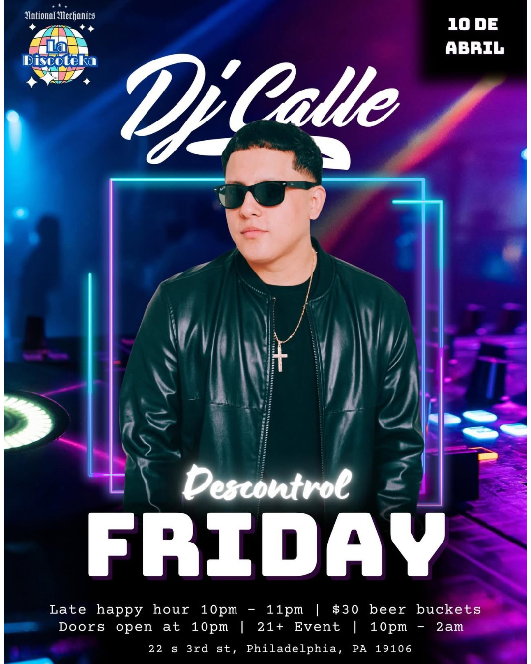 Descontrol Friday | DJ Calle Friday, April 10, 2026 10:00 PM 10:00 PM 22:00 22:00 Google Calendar ICS Decontrol Friday | DJ Calle 10pm-2am | Late Night Happy Hour 10pm-11pm + $30 Beer BucketsMore Info - La Discoteka IG
